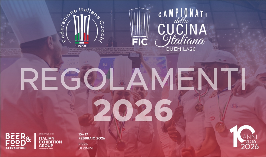 Dal 15 al 17 febbraio 2026 avrà luogo, presso Rimini Fiera, la 10ª edizione dei Campionati della Cucina Italiana, nell’ambito della manifestazione “Beer & Food Attraction”. L’evento rappresenta la più rilevante e articolata competizione culinaria a livello nazionale, riconosciuta ufficialmente dal circuito Worldchefs. Pubblichiamo di seguito i regolamenti delle varie competizioni previste. L’apertura delle iscrizioni