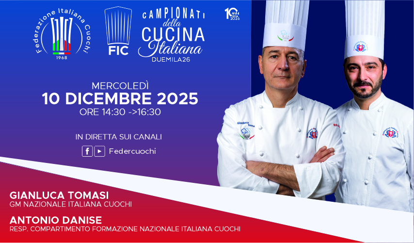 Il 10 dicembre si terrà la formazione propedeutica in vista della 10° edizione dei Campionati della Cucina Italiana che si terranno a Rimini dal 15 al 17 febbraio 2026. Dalle 14.30 alle 16.30, in diretta sulle pagine Youtube e Facebook della Federcuochi tutte le novità dei regolamenti della nuova edizione che celebra i dieci anni