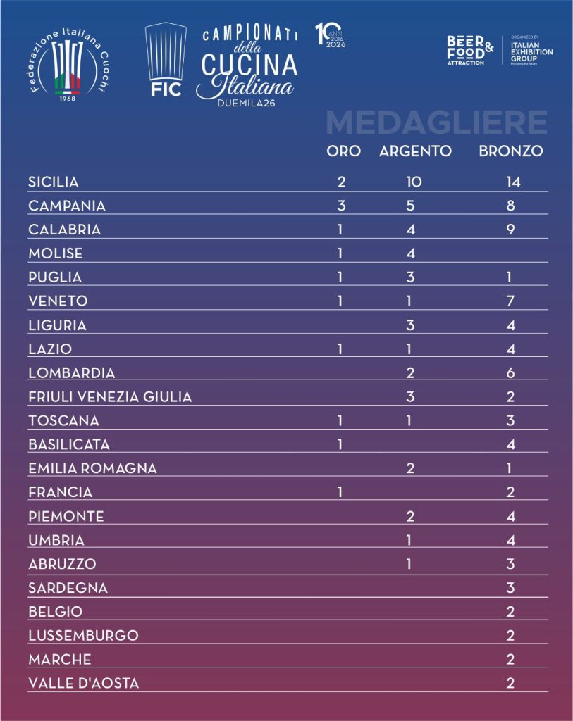 I Campionati FIC continuano a rappresentare la competizione culinaria più importante del nostro Paese, organizzata alla Fiera di Rimini da Federcuochi in collaborazione con Italian Exibition Group, e che quest’anno hanno portato in gara oltre 600 cuochi e coinvolto assistenti ed aiuti chef per un totale di circa 2mila professionisti che, con le loro creazioni scenografiche e 100% made in Italy, hanno mandato in visibilio il folto pubblico presente. Tra le prestigiose novità 2026, inoltre, le Cene delle Regioni, organizzate da FIC nel ristorante della Fiera, a fine giornata. Le cucine regionali hanno esaltato le materie prime di tre regioni d’eccellenza: Basilicata, Calabria e Sicilia, magistralmente rappresentate dalle rispettive Unioni Regionali, come ha sottolineato sul palco, durante i ringraziamenti, il responsabile nazionale Eventi FIC, lo Chef Seby Sorbello, che ha realizzato tra l’altro anche la cena siciliana, con il prezioso supporto dell’URCS e di alcuni componenti della sua brigata. Il plauso per questa brillante novità gastronomica è giunto anche dai presidenti regionali, Antonio Zazzerini (Basilicata), Carmelo Fabbricatore (Calabria) e Rosario Seidita (Sicilia). Le tre regioni, inoltre, hanno preso parte all’intera manifestazione, con i propri stand istituzionali delle rispettive Amministrazioni regionali, e la valorizzazione dei prodotti tipici di ciascun territorio.