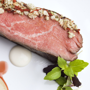 Cuberoll di angus scozzese, crema di formaggio affumicato, cremoso di topinambur e riduzione di ciliegia