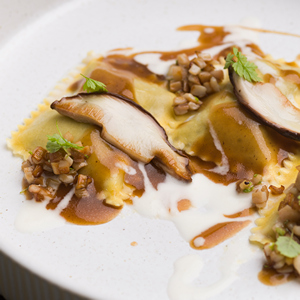 Bauletti con stracotto al Barolo DOCG, fungo porcino fermentato, fondo bruno e panna acida